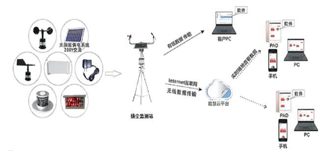 扬尘监测主要是针对大气中的污染物的监测,对其种类和浓度进行观察和分析,实时掌握各种污染物的动态变化以及它们对环境的影响。扬尘监测对象主要是飘尘、悬浮微粒等颗粒状的污染物以及气象参数等。对这种状态的污染物在大气环境中进行布点、采样、观察和分析等一系列质量监测工作。监测项目通常根据地区实际的区域特点、气候特点、污染源的分布情况来进行规定。针对这些现状,本公司设计研发了一套扬尘多参数(PM2.5、PM10、温度、湿度、风速、风向)的监测与信息共享系统设备。该系统主要包括三个部分:前端数据参数采集和无线传输设备、服务器接收解析和数据库、信息发布统计分析平台。