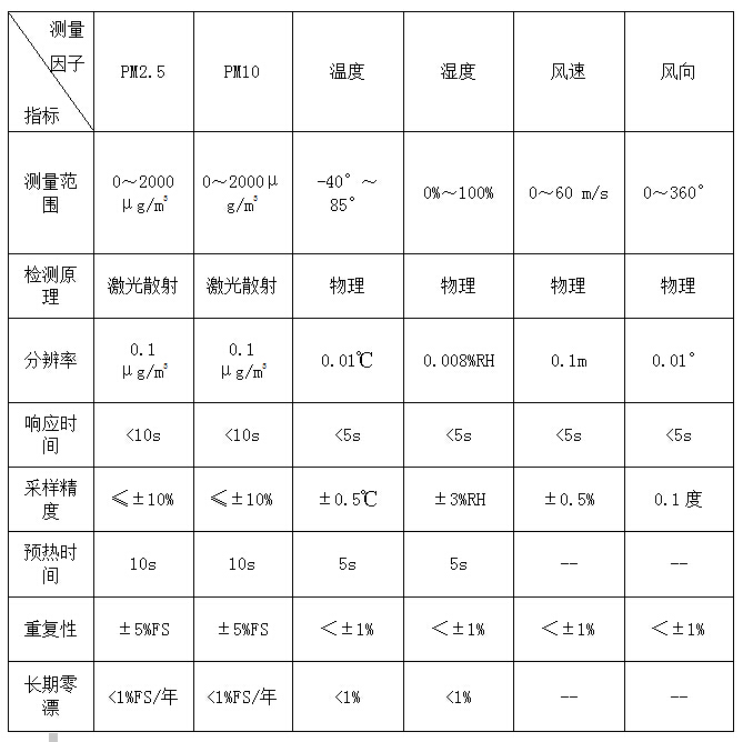 扬尘监测系统标配传感器测量因子指标如下图所示: