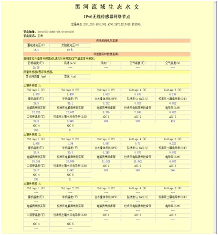 案例介绍:该系统是在国家发改委CNGI(中国下一代互联网计划)计划资助下,在黑河流域进行的一次生态水文无线传感器观测网络的研制和部署工作。该系统实现了实时在线监控功能,用户可在北京的数据中心,通过网络进行远程软 件更新、设备自检查、设备功能的远程设置和更改等功能。此外,该系统成功的实现了国内第一套基于IPV6技术的野外监测设备,用户可通过输入设备的IPV6地址即可实时通过网页浏览野外设备的监测数据,为下一代基于IPV6的物联网技术打下了基础。